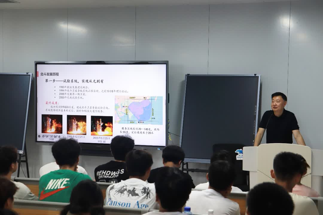参观环节结束后,北斗智联九江产业基地总经理王石白为同学们带来了题为《北斗卫星导航系统的发展》的专题讲座。讲座中,王石白结合自身多年科研与项目经验,向大家系统介绍了北斗卫星导航系统的发展历程、技术突破及在国土测绘、交通运输、农业农村、应急救援等领域的广泛应用,让同学们对北斗产业的整体布局有了初步认识。在互动交流环节,同学们踊跃提问,围绕专业学习方向、职业发展规划等话题与工程师展开热烈讨论,现场氛围活跃。
