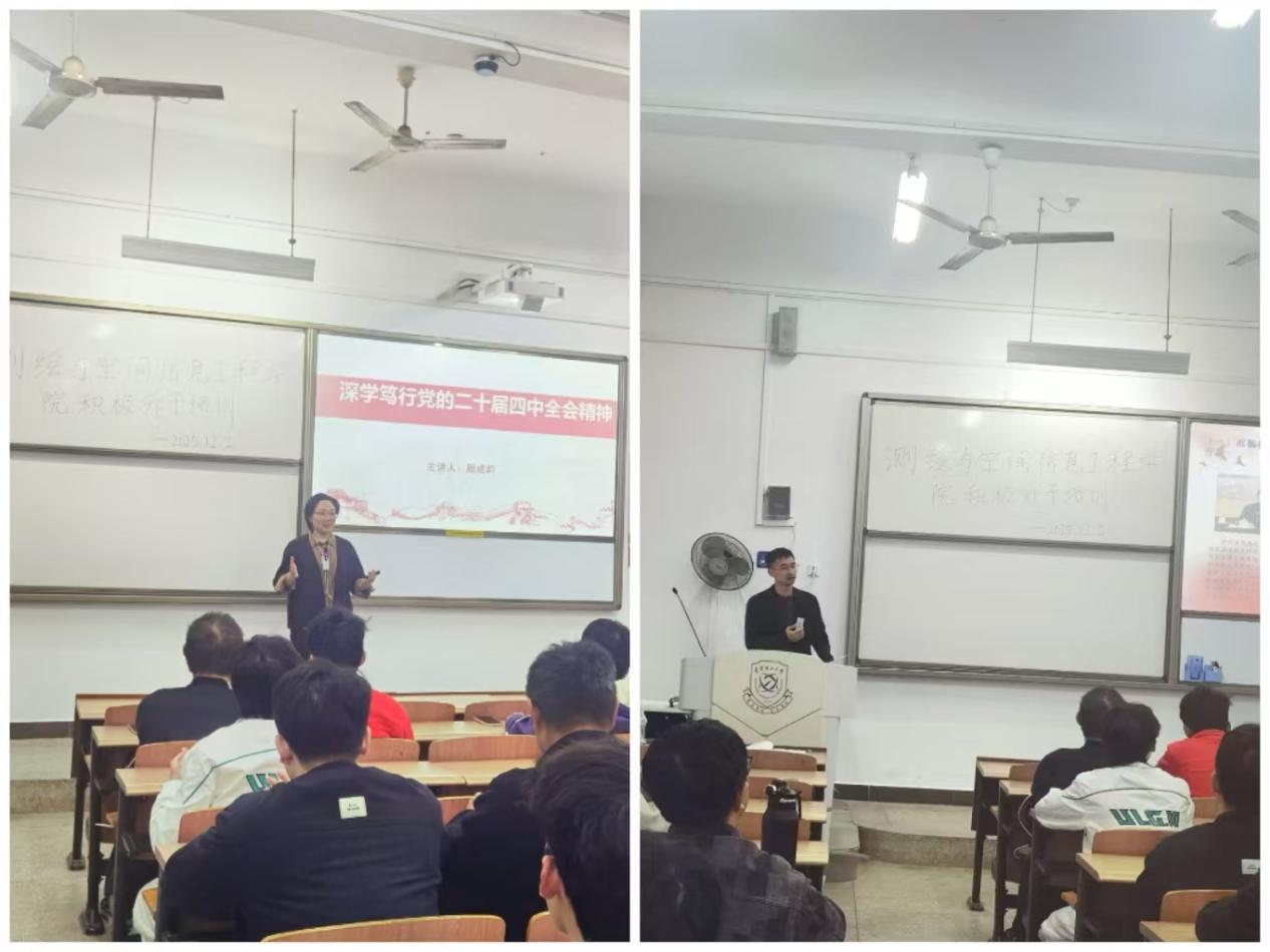 为加强入党积极分子培养教育,及时学习贯彻党的最新理论成果与决策部署,2025年12月2日,测绘与空间信息工程学院党委面向入党积极分子开展学习党的二十届四中全会精神专题培训,马克思主义学院副院长周成莉、测绘与空间信息工程学院党委副书记张晓平担任主讲。